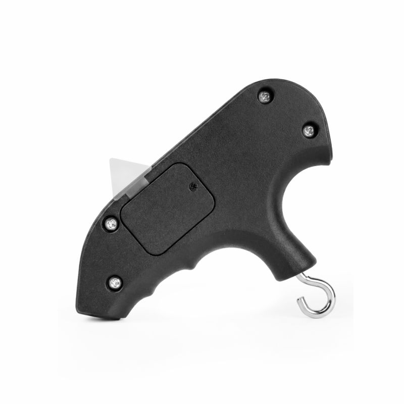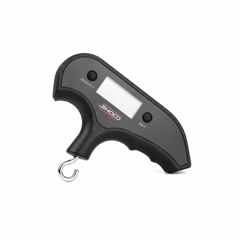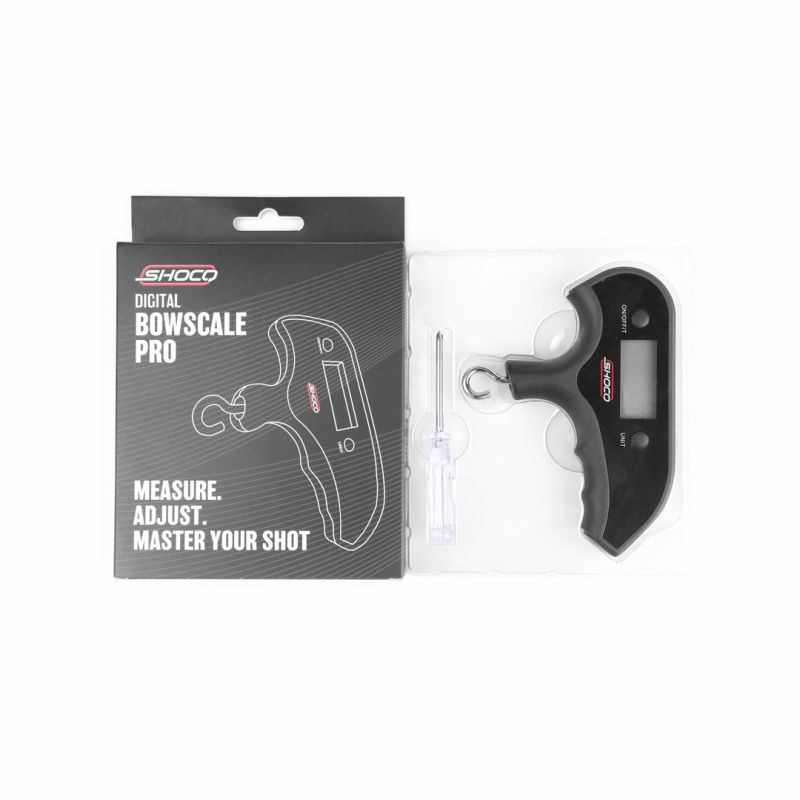 Handheld digital bowscale featuring an LED screen with peak hold and let-off display, measuring up to 110 lbs and designed with an ergonomic grip.